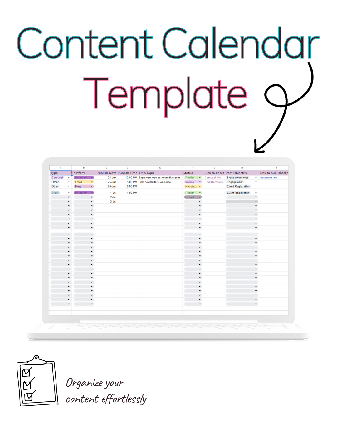 Whether it's email newsletters, blog posts, or social media, this template has you covered with colour-coded, editable columns, drop-downs, and check boxes.